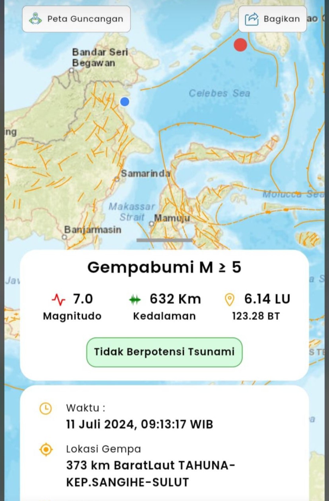 “Episenter Gempa Bumi terletak pada koordinat 6,13° LU ; 123,30° BT, atau tepatnya berlokasi di laut pada jarak 371 Km arah Barat Laut Kota Tahuna, Sulawesi Utara pada kedalaman 636 Km. pada hari Kamis (11/7 /2024) pukul 09.13.17 WIB,” hasil release BMKG.